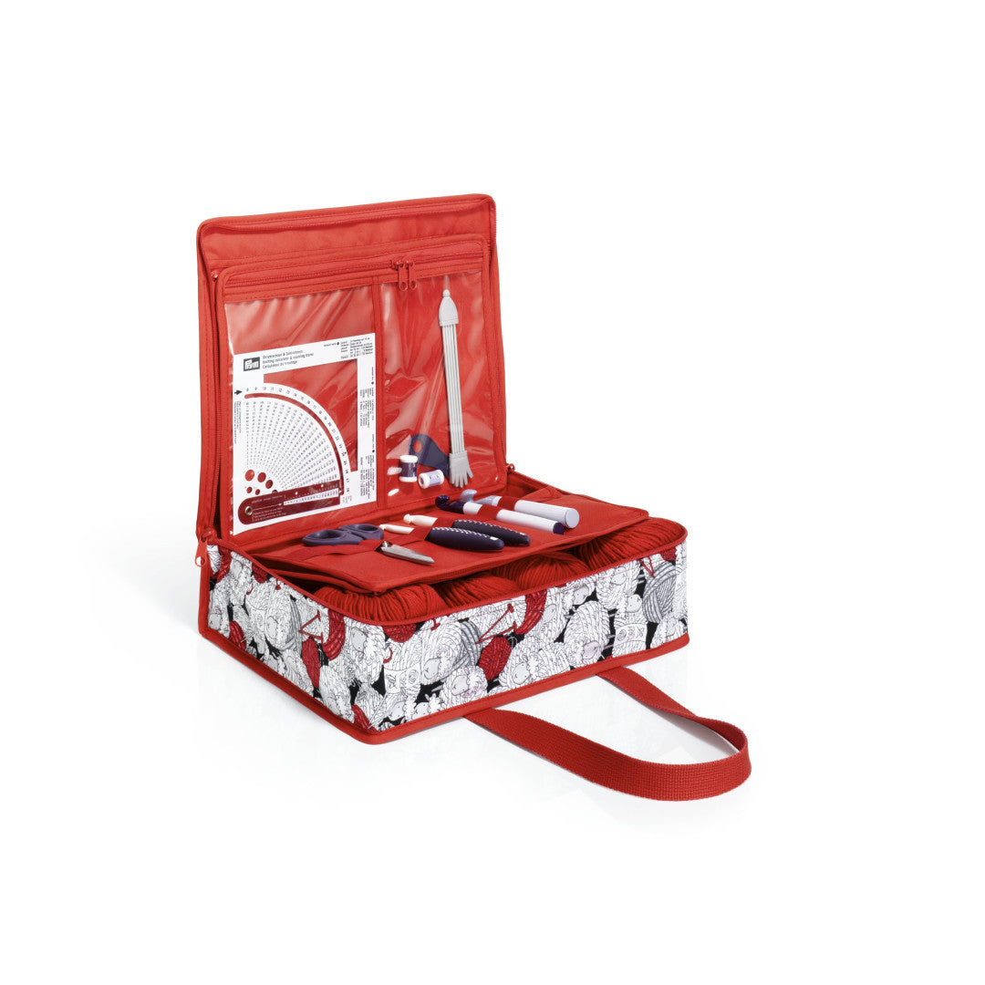 This handy all-in-one Merino needlework bag leaves nothing to be desired, if you want to store and transport sewing utensils, knitting and crochet tools and much more. With eight transparent inner pockets for small haberdashery items and twelve further loops for storing larger accessories, the all-in-one needlework bag is a real space-saving miracle. Its rectangular shape and high quality of workmanship make it even more attractive. A further highlight is its really lovely design with the striking contrast between the red balls of wool and the black and white merino sheep. Sturdy black shoulder straps are ideal for carrying it, whether on your travels or to the next craft course.