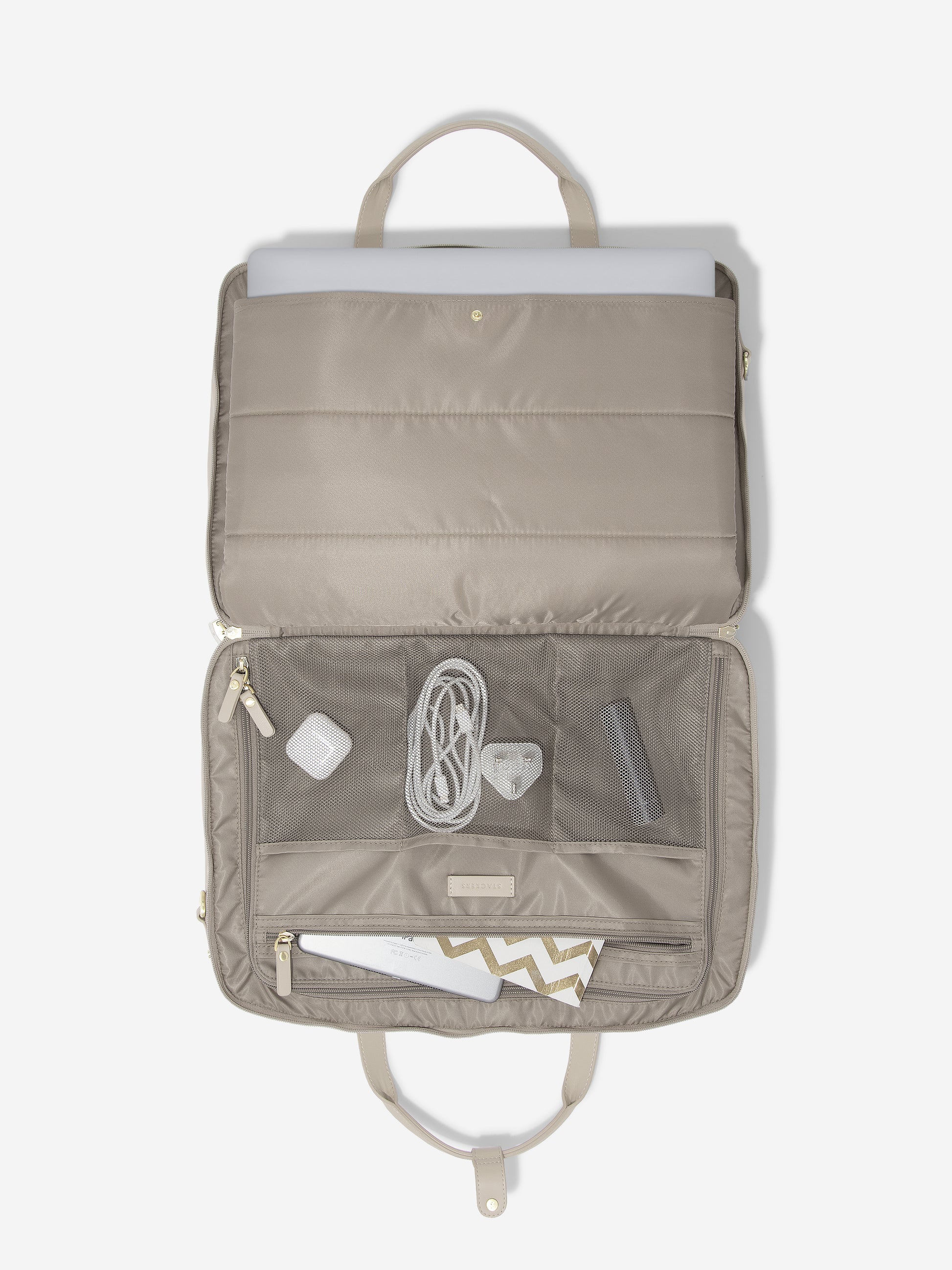 Inside, there's a velvet-lined laptop pocket with popper fastening, so you can access your electrical items without opening the entire bag. The bag has two large zipped compartments, one with compression straps to secure your items. With a range of additional pockets and compartments to keep smaller items separate.