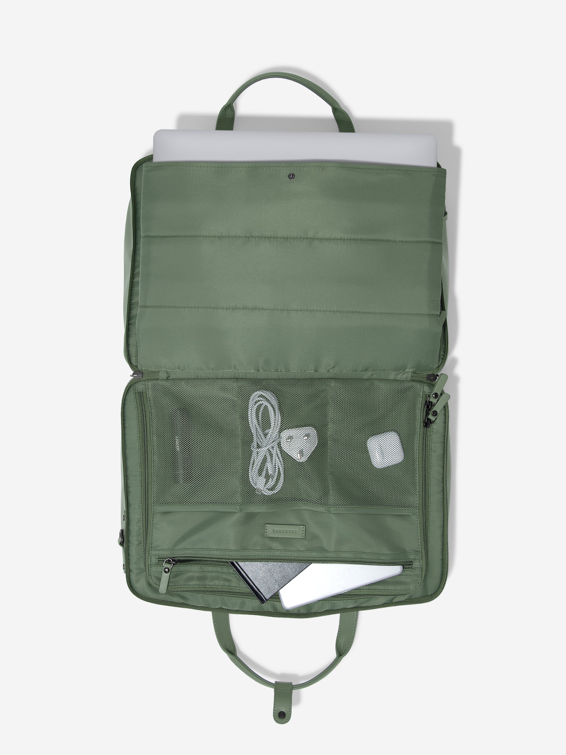 Inside, there's a velvet-lined laptop pocket with popper fastening, so you can access your electrical items without opening the entire bag. The bag has two large zipped compartments, one with compression straps to secure your items. With a range of additional pockets and compartments to keep smaller items separate.