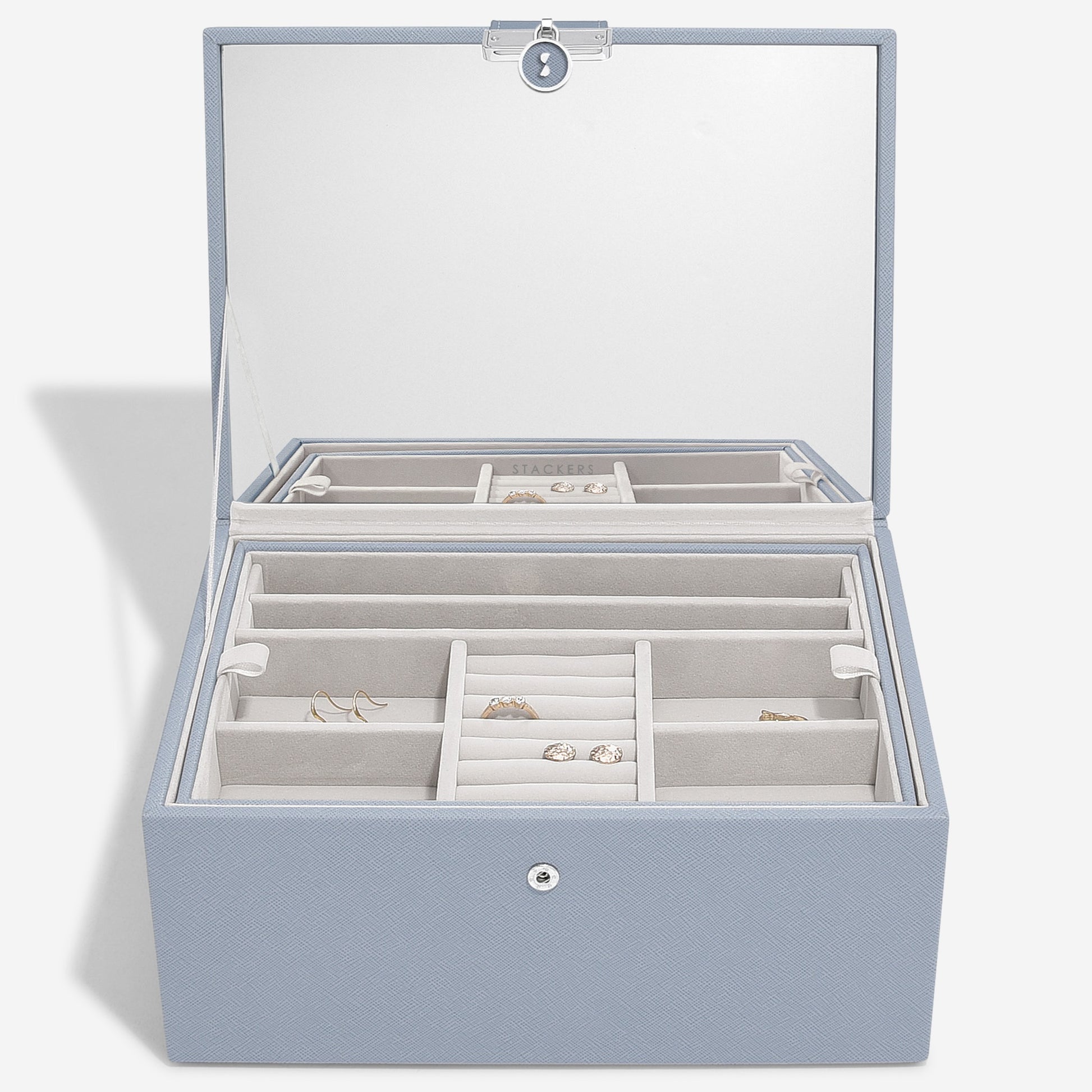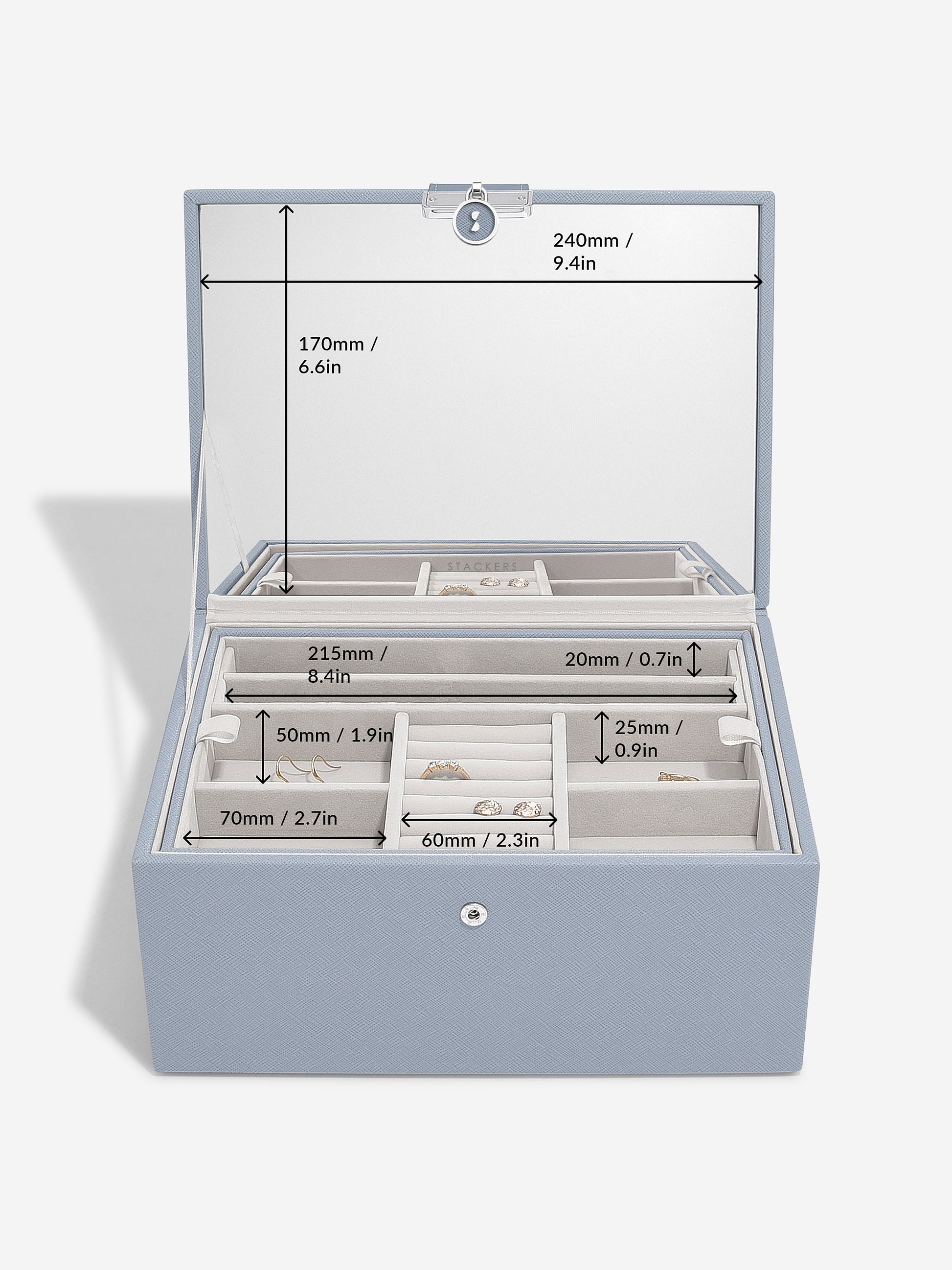 Inside there is a Stackers branded mirror and plenty of space to keep your necklaces, rings, earrings, watches and more safely organised and displayed. The top tray includes a ring roll for rings and stud earrings, long necklace sections and further sections for bracelets and statement earrings. You can add the Pendant Necklace Accessory and Earring Accessory to the tray for more storage. Underneath are larger sections for chunky jewellery and accessories, which can fit the Ring Roll or Watch Pad.
