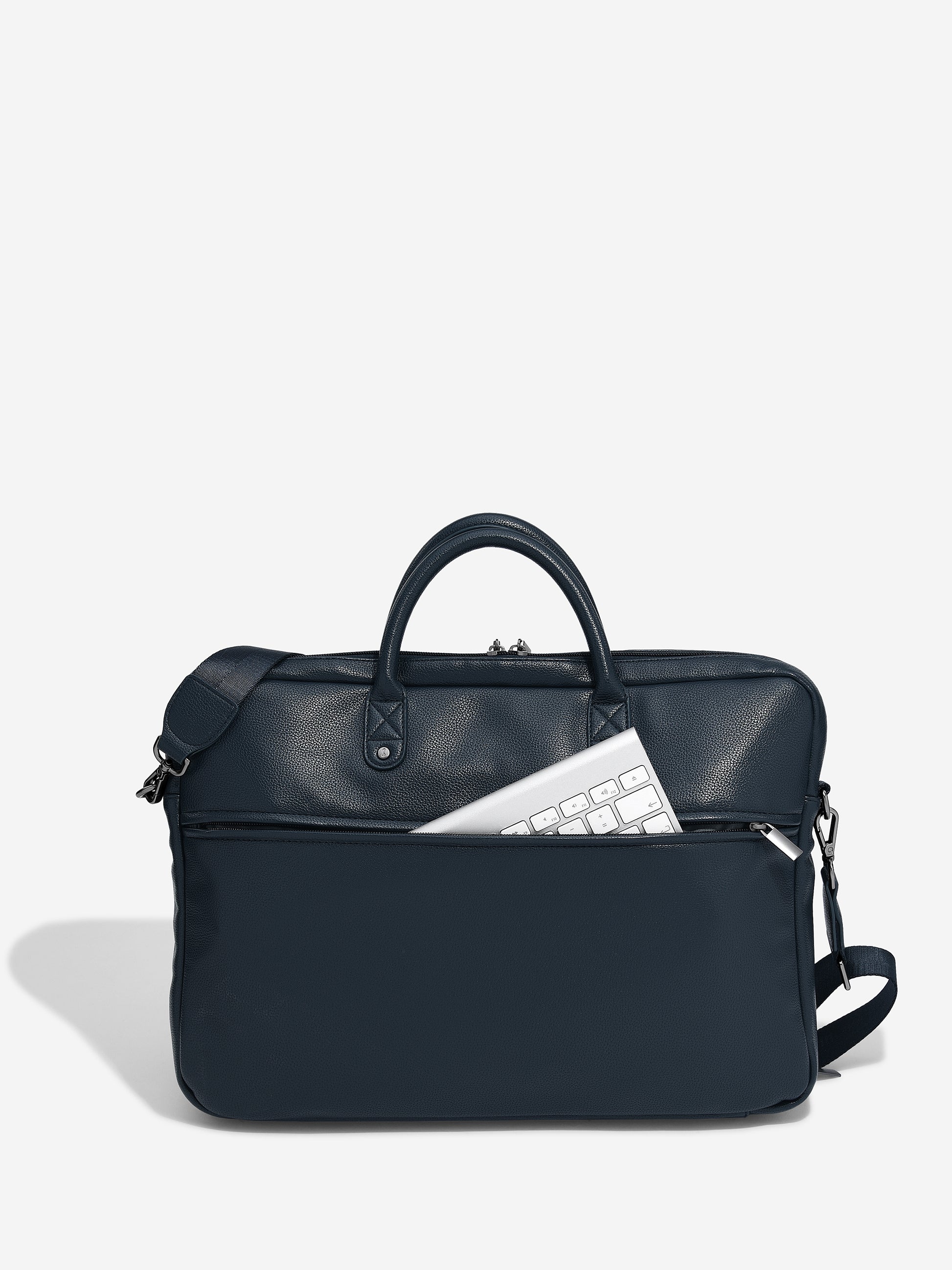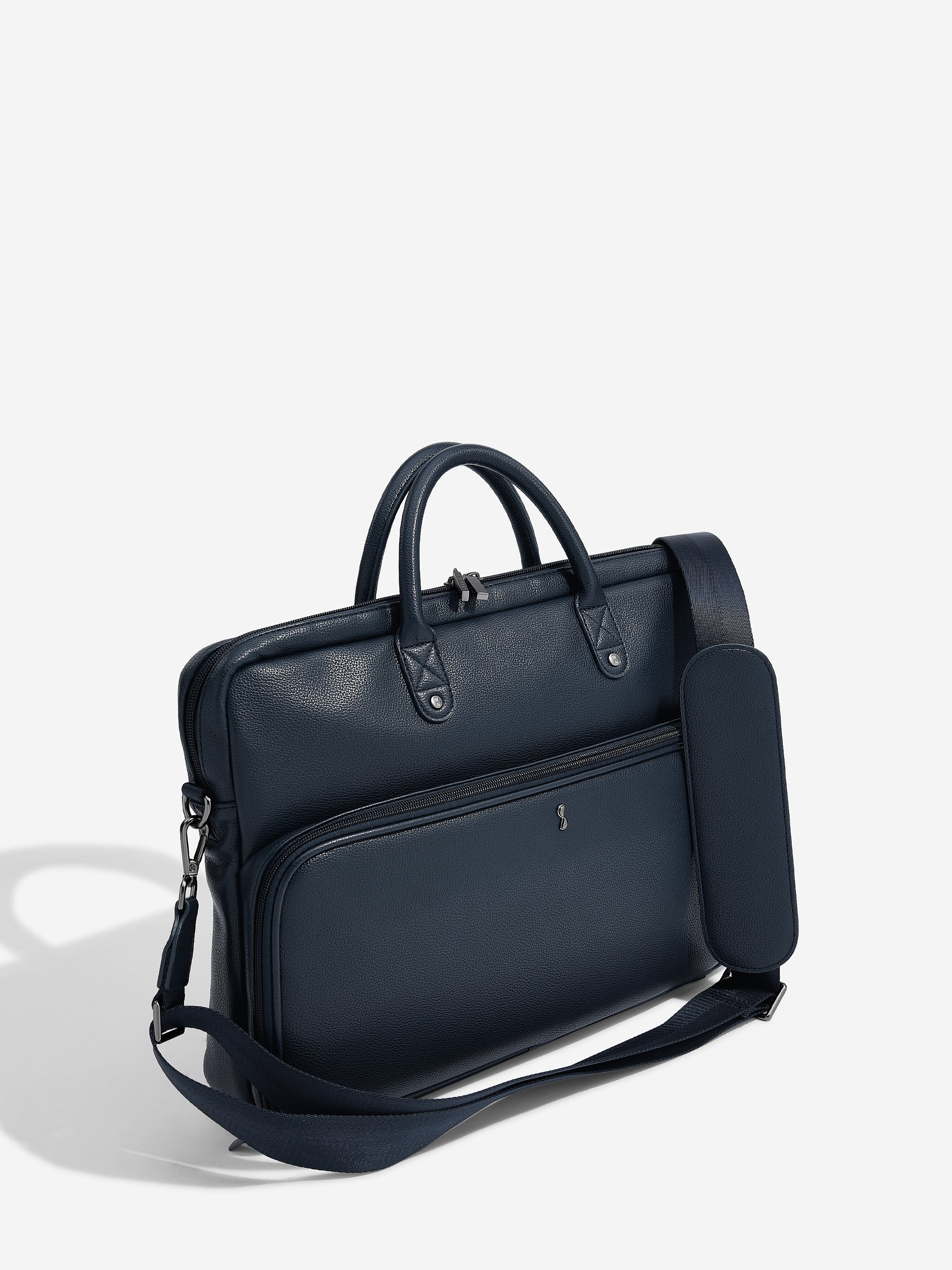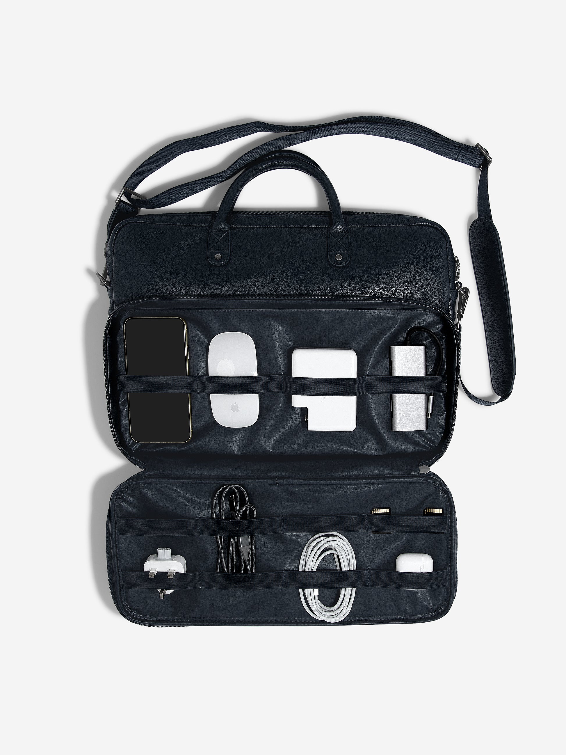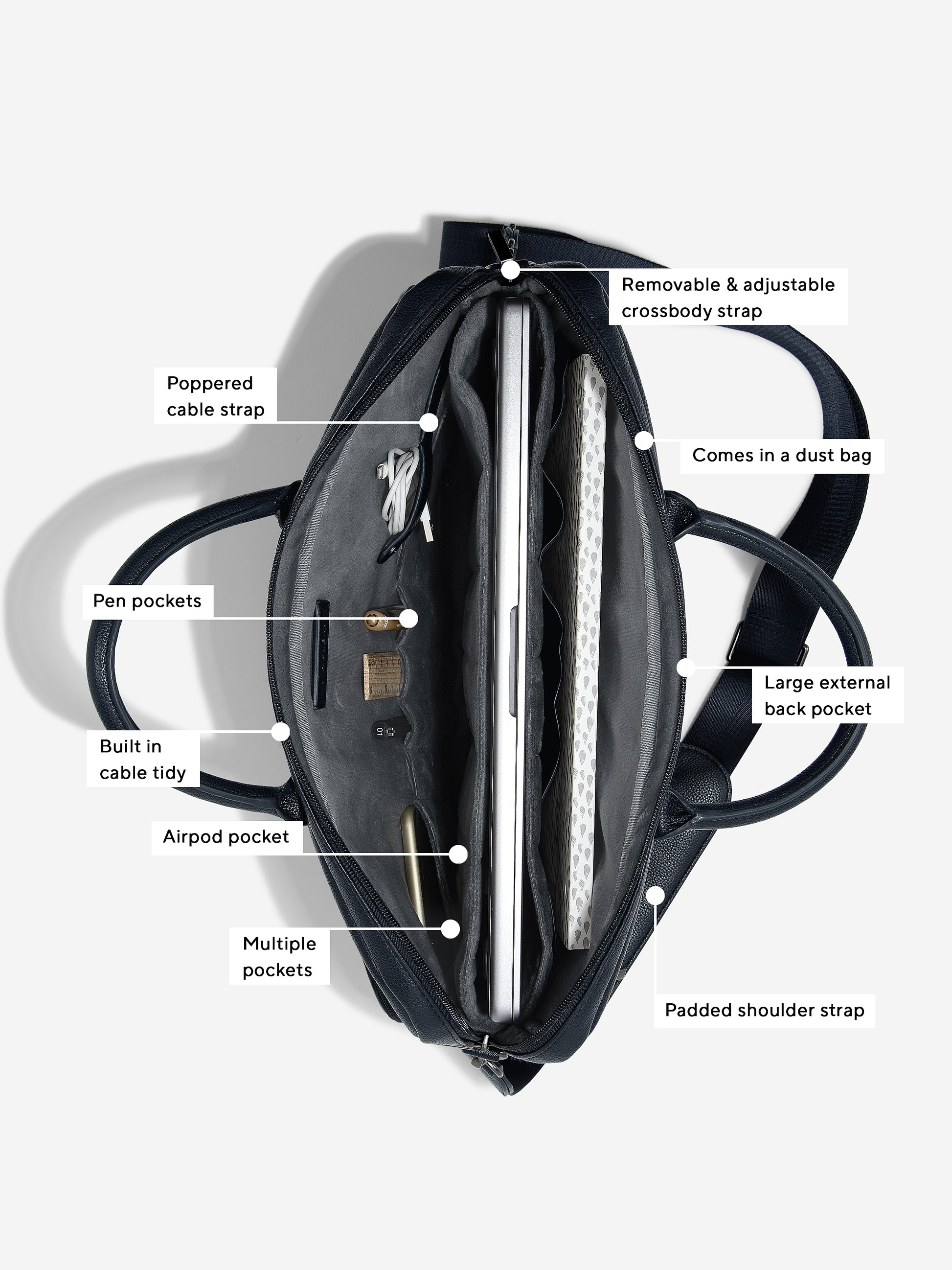 The 16" Laptop Bag has space for up to a 16-inch laptop, with a padded central pocket to keep your laptop protected. Within the interior, there are multiple pockets including pen pockets, a pocket for your air tag, a built-in card case and a key chain. The front pocket boasts huge storage for cables and chargers. Adjustable shoulder strap as well as carry handles. Key features: • Soft faux leather exterior • Padded interior • Space for a laptop (up to 16 inch) • 2 different ways to wear • Multiple internal and external pockets • Front pocket built-in cable tidy